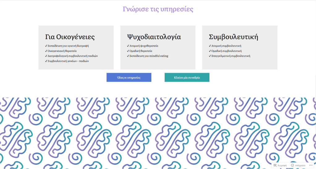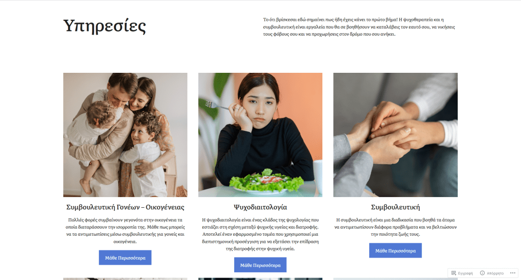 Κατά τη δημιουργία αυτής της ιστοσελίδας, εστίασα στην απλότητα. Η προτεραιότητα του πελάτη ήταν να δημιουργήσει ένα site που να είναι καθαρό, λειτουργικό και οπτικά ευχάριστο. Στόχος ήταν ο ιστότοπος να είναι φιλικός προς τον χρήστη πάνω από όλα. Δημιούργησα αυτήν την πλατφόρμα για να παρέχω στους πελάτες της έναν διαδικτυακό χώρο όπου μπορούν εύκολα να την προσεγγίσουν και να αποκτήσουν πληροφορίες για τις υπηρεσίες της. Αυτή τη στιγμή, ο πελάτης επέλεξε να μην αγοράσει ένα domain name, έτσι έφτιαξα τον ιστότοπο χρησιμοποιώντας το δωρεάν πρόγραμμα που προσφέρει το WordPress.
